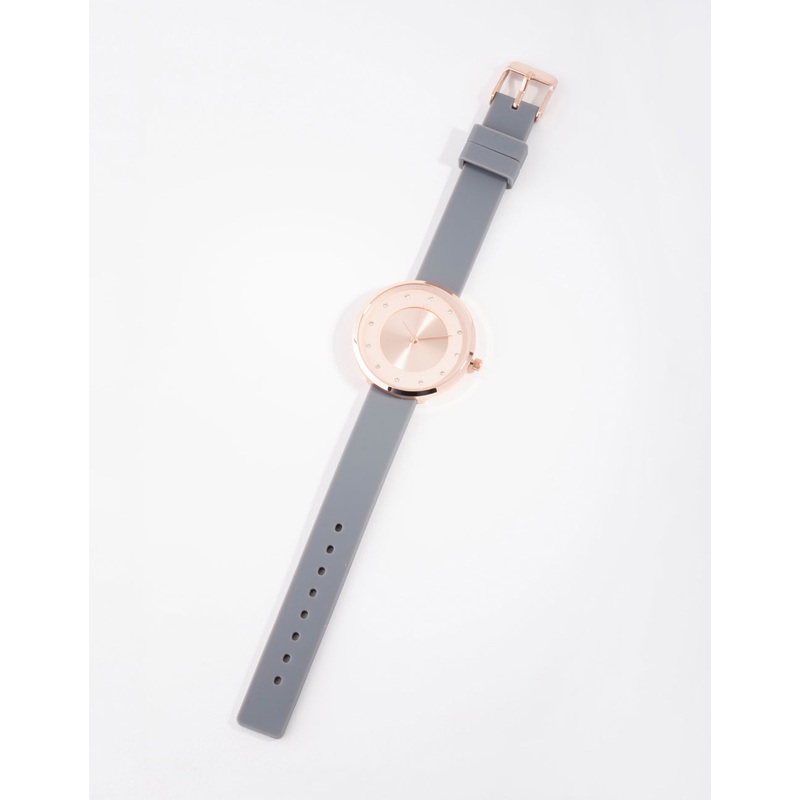Tell the time and look stylish while doing ita watch is the ultimate useful fashion accessory! This one is rose-gold toned with a pink face and diamantes in place of numbers. It has a grey silicon band, and has a simple yet modern vibe. Youve found your new everyday watch!