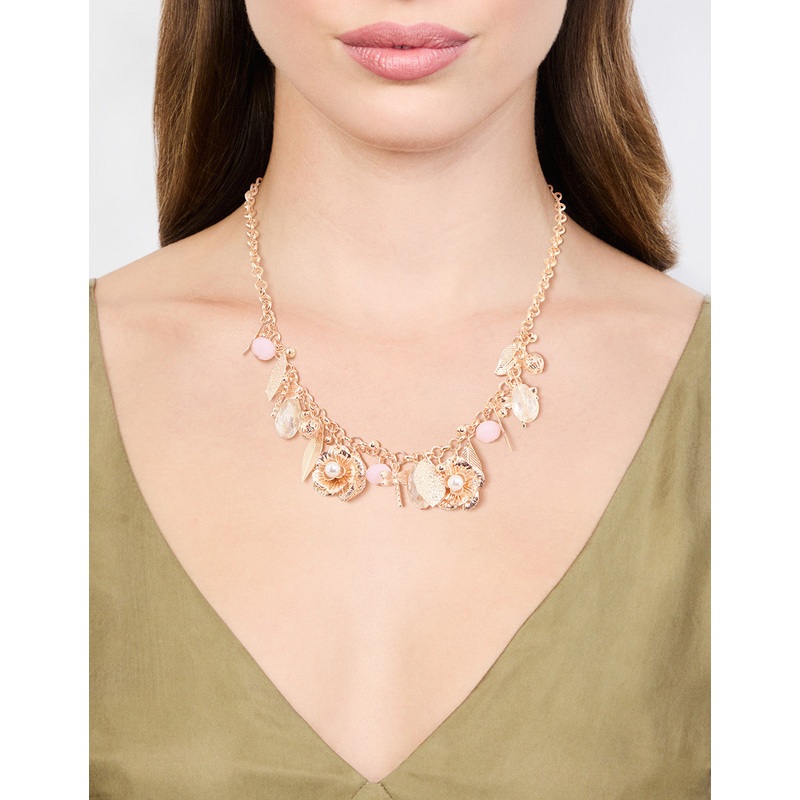 Add charm and elegance with this necklace! Featuring a rose gold-toned base with leaf and flower designs, it’s perfect for a floral touch.