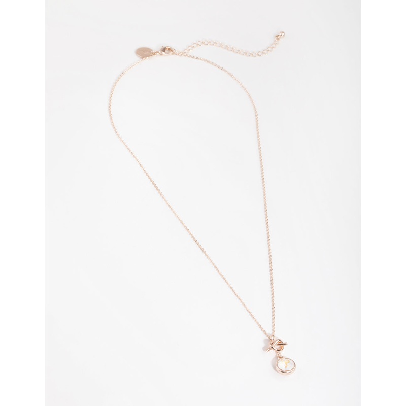 This lovely necklace is sure to make you shine! It’s rose-gold toned, and features a twist pendant design with a hanging Diamond Simulant crystal. The crystal has a milky hue and an iridescent finish. Wear it and sparkle!