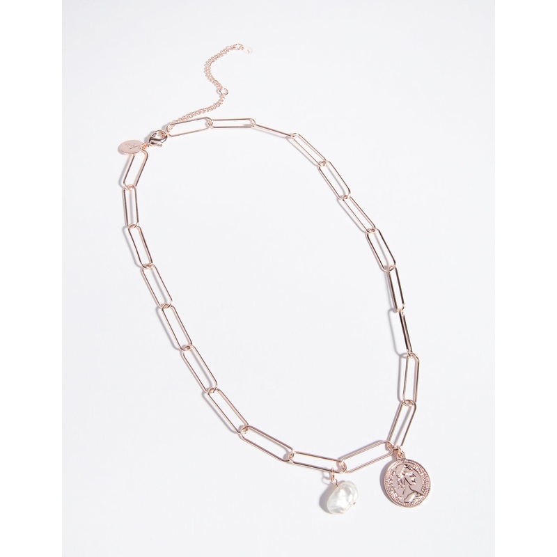 Were lifting the chain game. This short rose-gold-toned necklace features large rectangle chains with a coin and pearl pendant. This can be worn with any outfit so versatile!