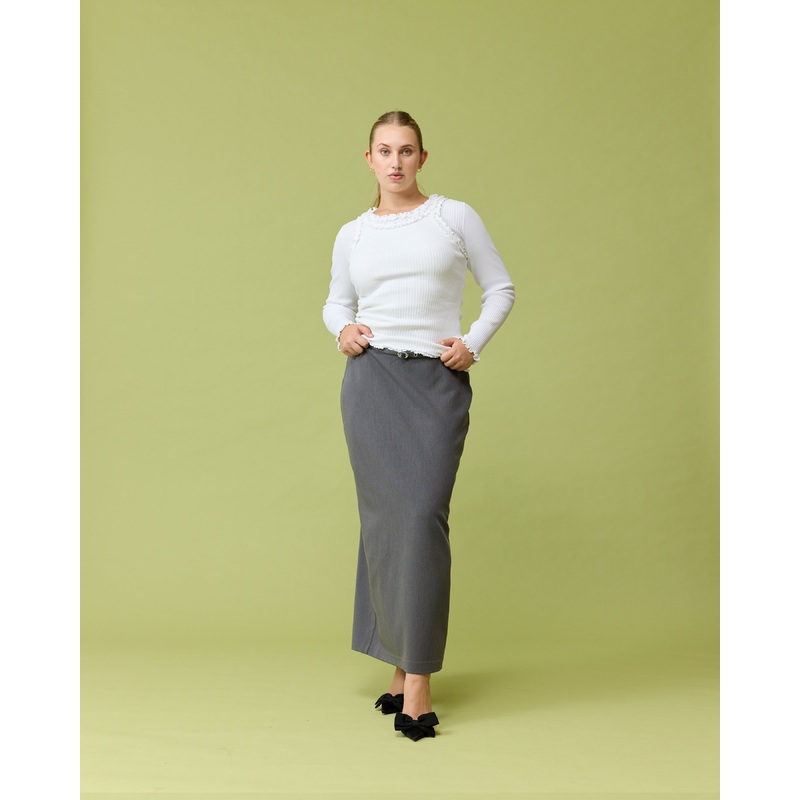 Suit style maxi skirt with a detachable belt with eyelet detailing. This skirt features a back split for ease of movement and back pockets.