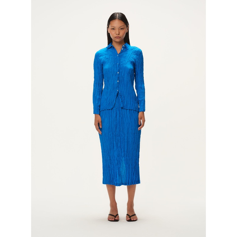 This vibrant azure blue midi skirt features a sculptural crinkled texture that adds dimension and elegance to its minimalist silhouette. Crafted from lightweight, fluid fabric, it drapes naturally while maintaining its shape. Designed with an elastic waistband for comfort and a side slit for ease of movement, it transitions effortlessly from day to evening. A refined yet easy-to-wear piece that pairs well with everything from relaxed tops to tailored separates.