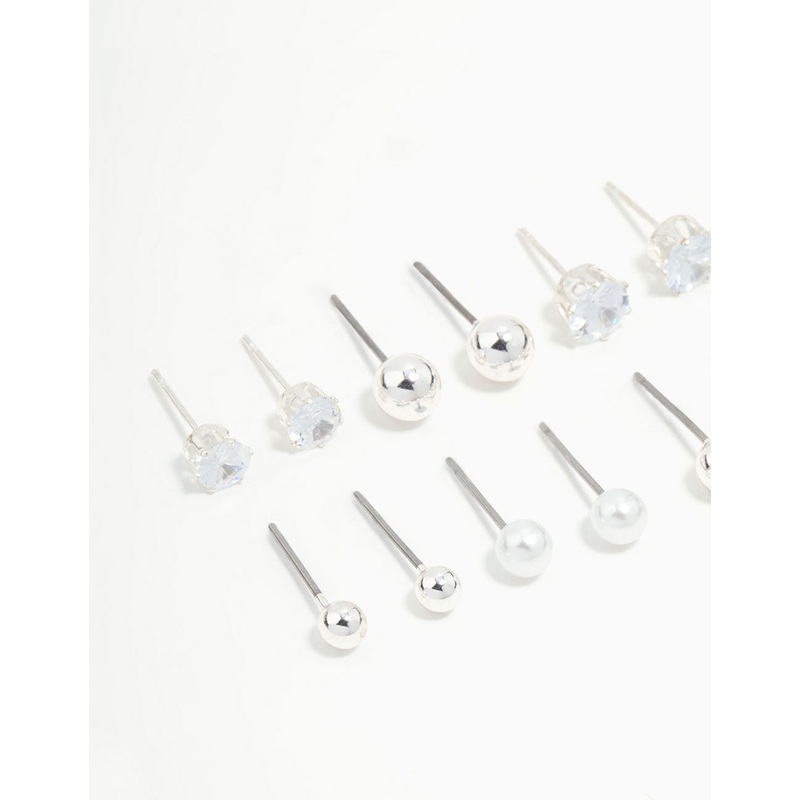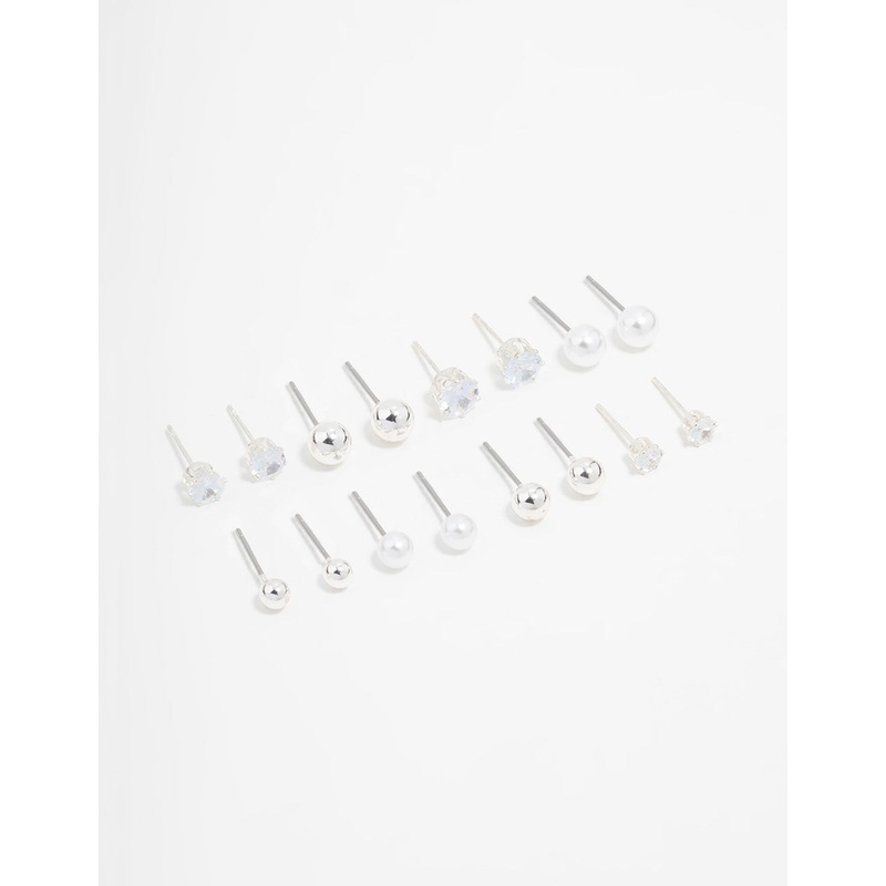 Silver Diamante & Pearl Stud Earrings 8-Pack