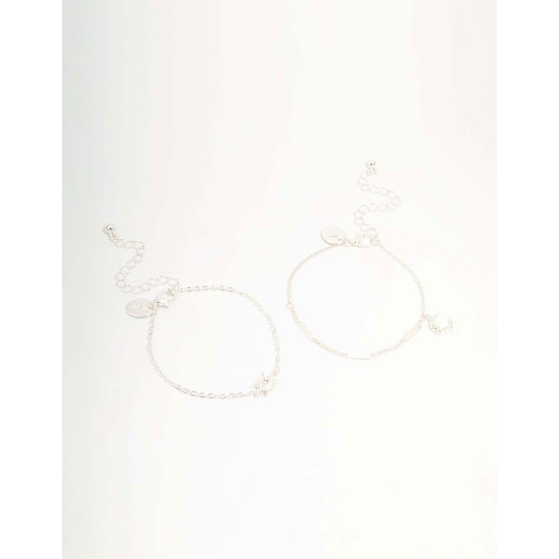 Dazzle with this duo of silver star and moon bracelets. This set of celestial stunners are perfect to complement any ensemble. Mix and match these bracelets or wear them together for a celestial-inspired statement.