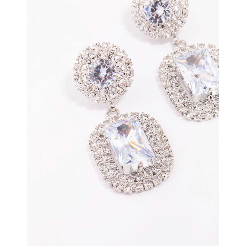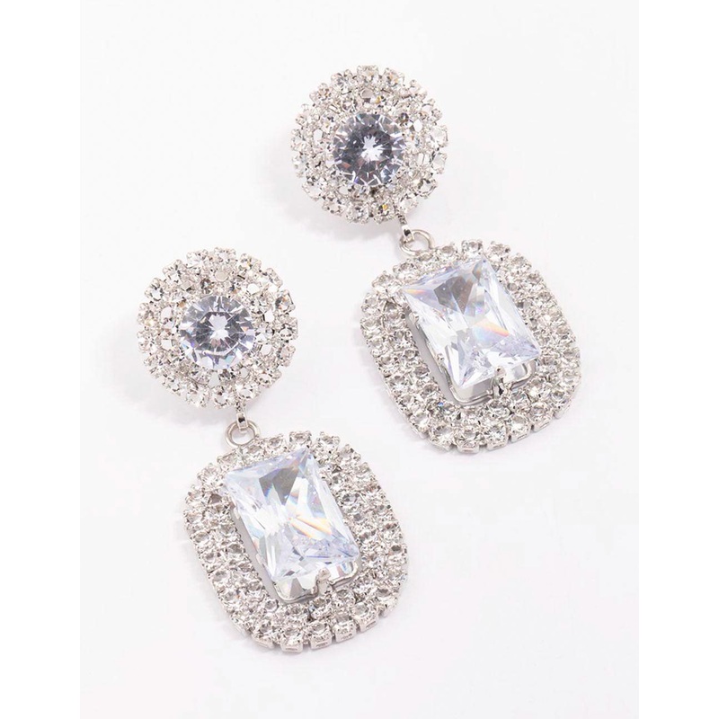 Channel Old-Hollywood glamour with these stunning silver-toned drop earrings. These unique statement earrings feature a duo of square-cut crystals, encased in a halo of mini diamantes for an eye-catching finish.