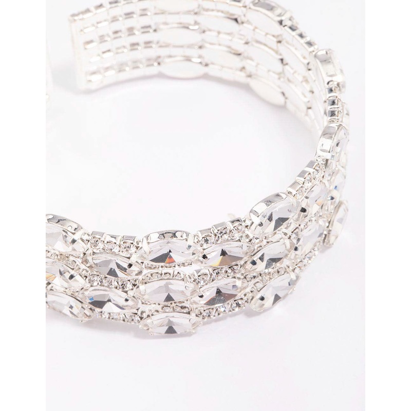 For an eye-catching addition to your stack, style this stunning silver wrist cuff. This unique cuff features a collection of oval-shaped diamante clusters, perfect for adding a hint of glamour to your look.