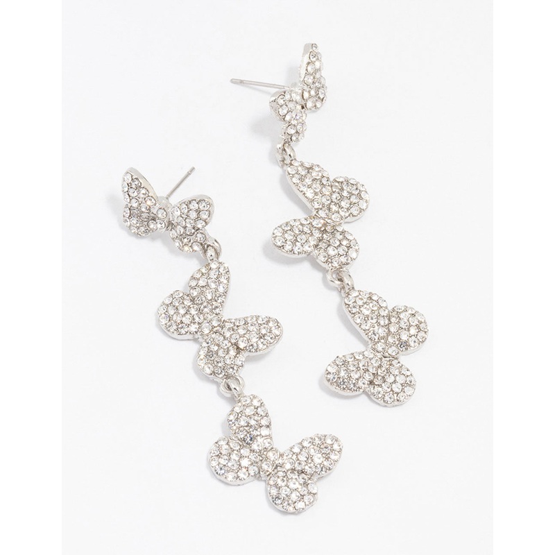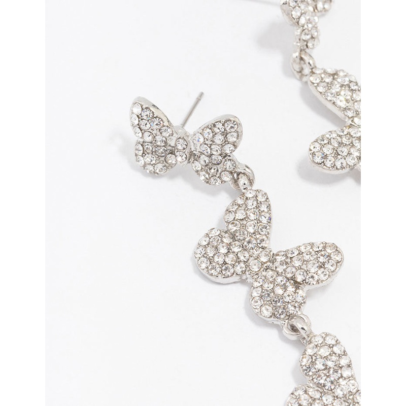 Silver Triple Butterfly Diamante Drop Earrings