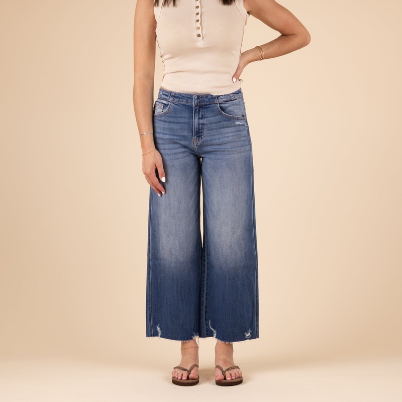 Show off your laidback yet trendy style with this pair of cropped high-rise wide-leg jeans. The Shelly jeans come in a Medium Wash color with a scissor cut hem to give it a nice tough look. Made with comfortable stretch denim to nicely hug your legs while giving you comfort that’ll last all day. Featuring a classic 5-pocket style, a hook & eye closure with a zip fly.