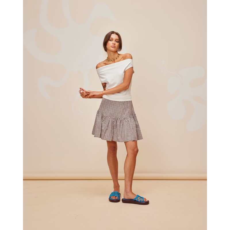 Floaty basque style mini skirt imagined in abrown ginghamcotton.This skirt features a dropped bodice style waistline, that falls to a full skirt.