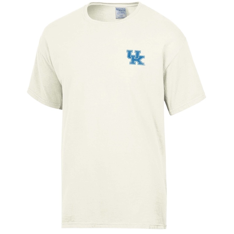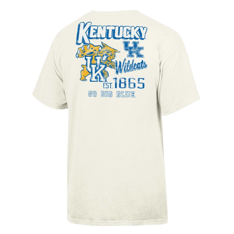 Show your Wildcat pride in this cream Kentucky Wildcats short sleeve tee. Features a small UK logo on the front and bold mascot graphic with Go Big Blue on the back.