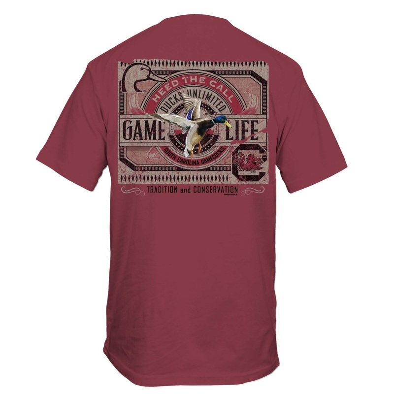 Celebrate tradition, conservation, and Gamecock pride with the Carolina Ducks Unlimited Game Life T-Shirt. This garnet short sleeve tee features a small Ducks Unlimited and Carolina logo on the front and a bold, full-color back graphic with a flying duck, Game Life slogan, and Heed the Call banner. Perfect for gamedays, outdoor adventures, or everyday wear.