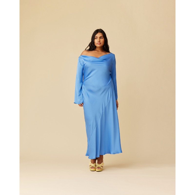 Bias cut long sleeve dress imagined in a luxe sonic blue satin. Features a built in waist tie to allow you to cinch as you wish. Simple yet versatile.