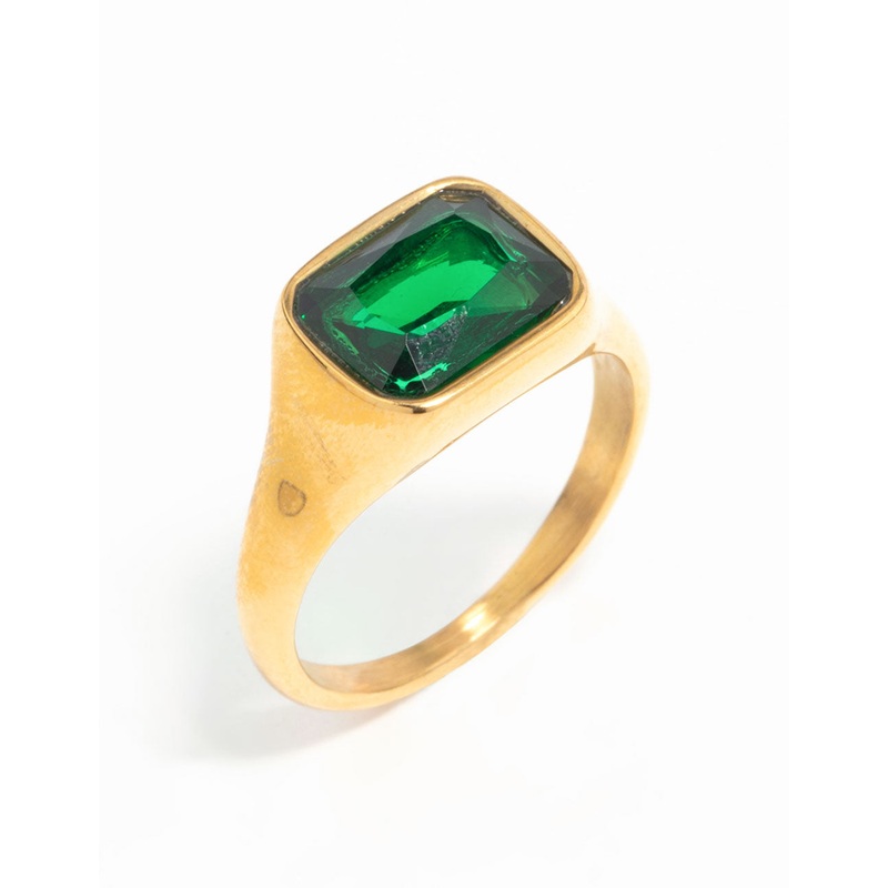 Waterproof Gold Plated Stainless Steel Opulent Green Cubic Zirconia Signet Ring
