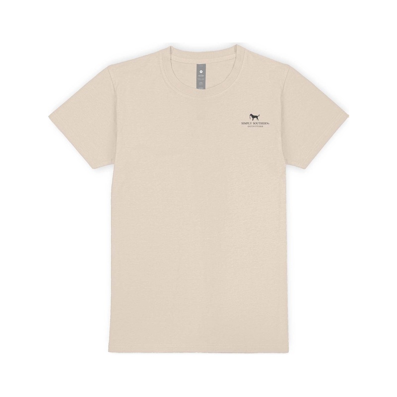 Tan short sleeve shirt with a deer standing in front of a camo patterned plaque. Simply Southern logo present and on left chest.